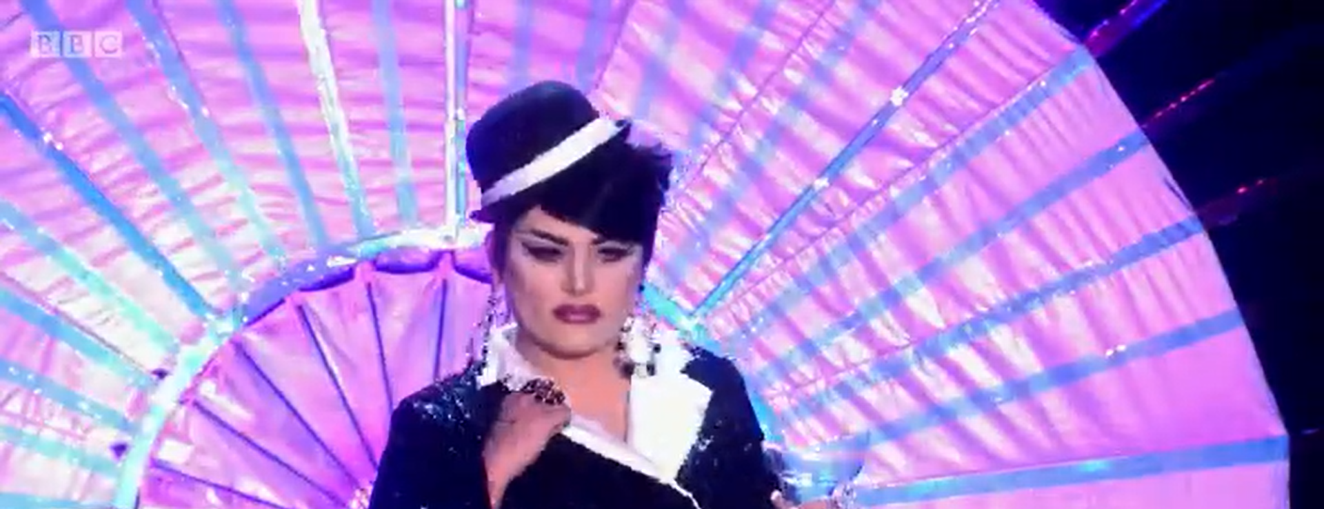 | Going total bondage in a black latex outfit complete with a cracking whip that terrifies poor Maisie Williams, this feels fresh and very different from what the other competitors brought out. |