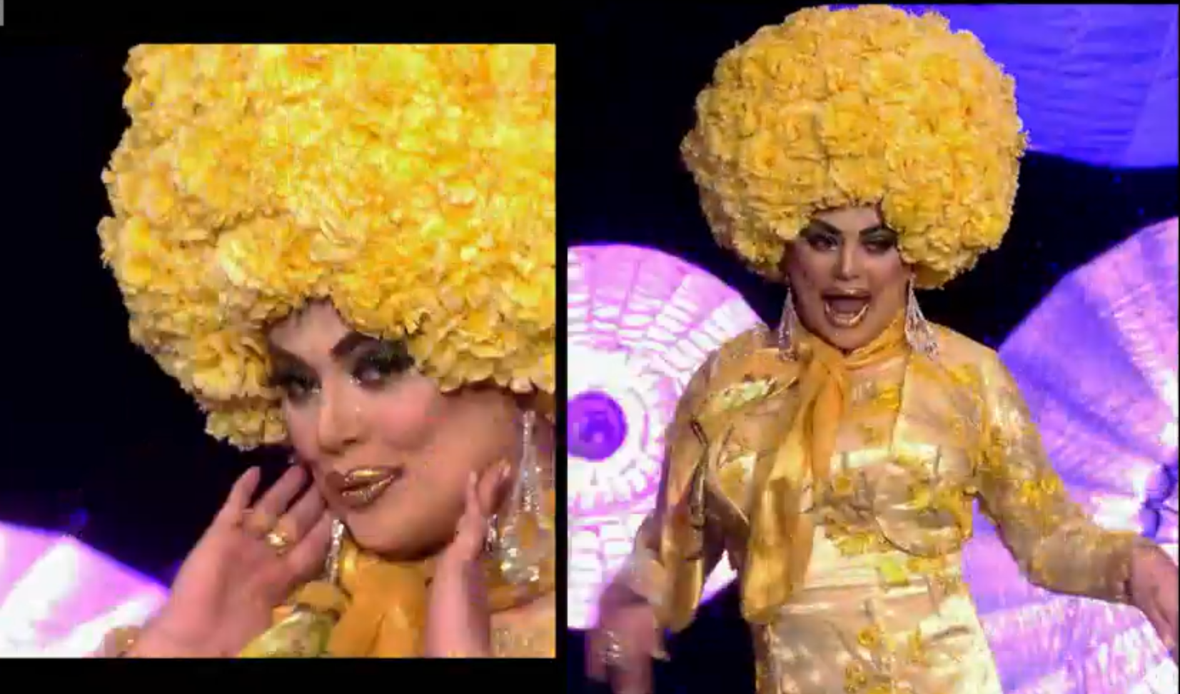 | A lovely switch up compared to the lacklustre previous two weeks, it was camp British drag and I loved the yellow colour on her. |