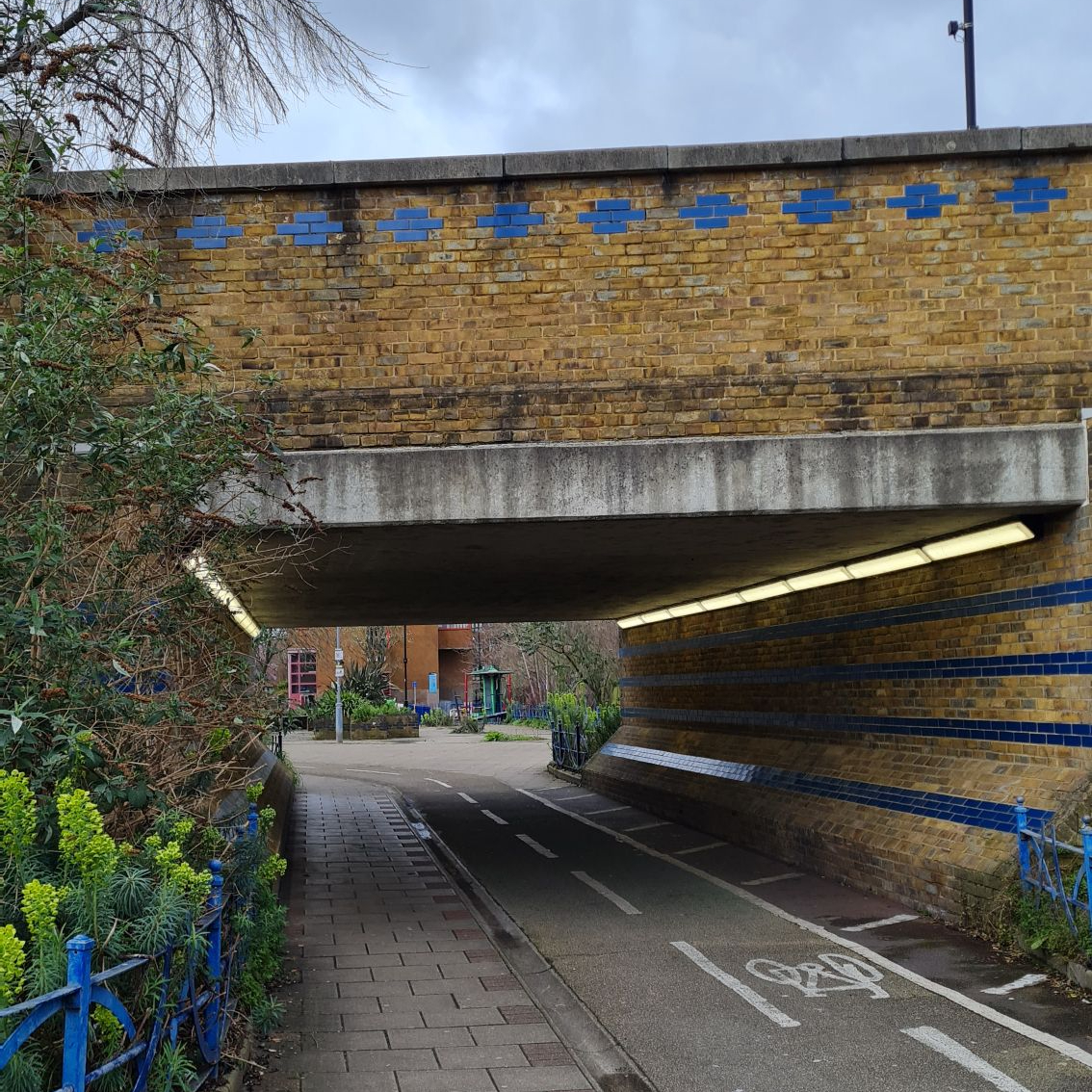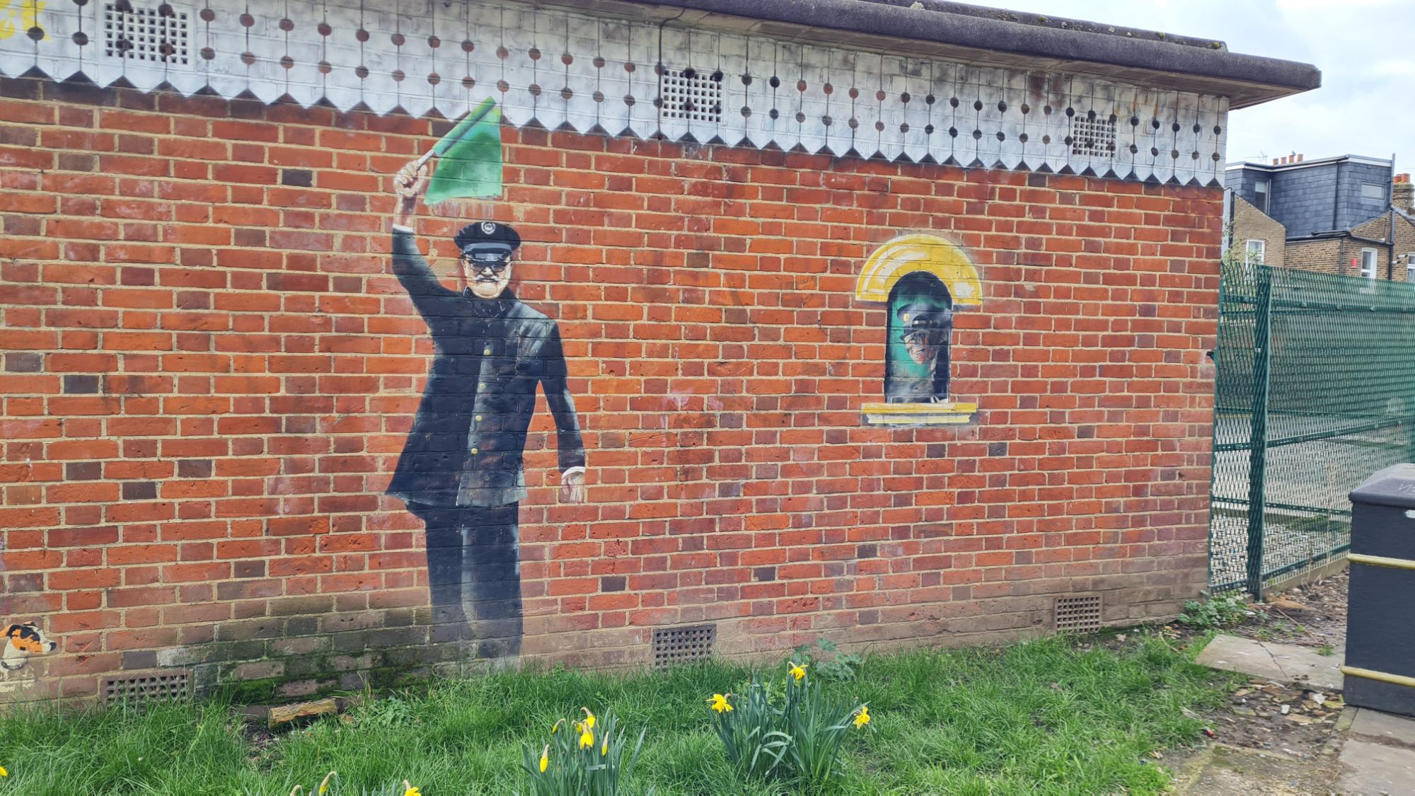 A pathway between the nearby Langham Place and Downhills Park Road features the next gem of the walk. Haringey Council has placed replica railway lines into the concrete where the trains would have run. A plaque on the ground between the two sets of tracks recognises the Palace Gates Line. My favourite part of this however is a mural on a small building of a steam-era guard waving a green flag, a lovely touch. The way was once again blocked by some private allotments, this time the Mannock Road allotments. Thankfully, Mannock Road ran parallel to this latest obstacle, so I quickly got to the other end and to the next bridge on the route.