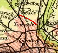 It was at that point that the railway turned from being in a cutting to being on an embankment and, in typical fashion for this line, very little trace of the line can be seen today. This was particularly disappointing at the site of the second intermediate station of the line, Noel Park and Wood Green, temporarily the terminus before the extension to Palace Gates (Wood Green) was completed later in 1878. In the 1970s, the imposing Wood Green Shopping Centre was built, which destroyed all traces of the line, which would have crossed the road on a high bridge.