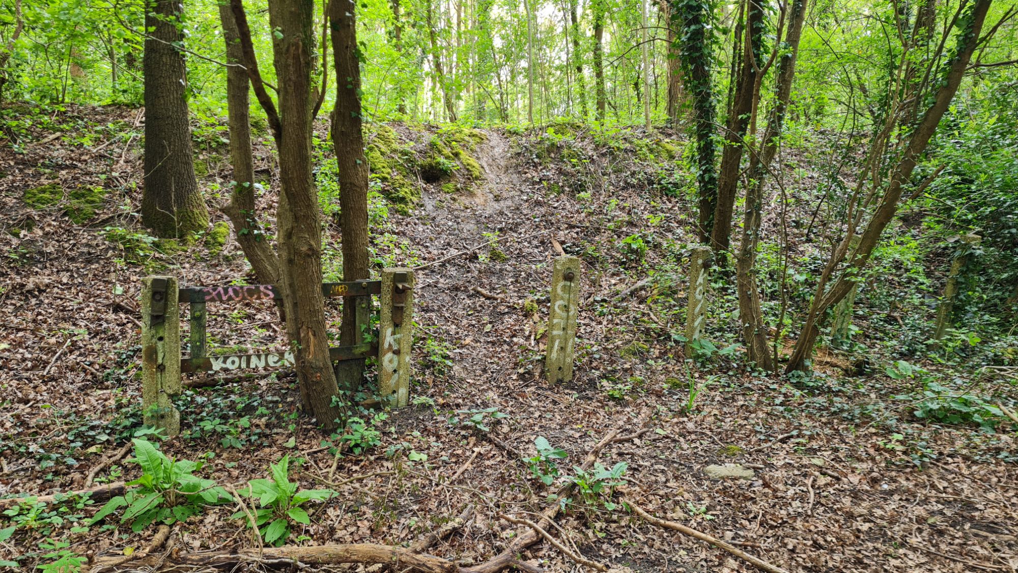 After leaving Bramley & Wonersh, trains would have run for 5 miles until the next stop on the line. I squeezed past the reconstructed level crossing gates, and felt a drop on my shoulder. The sky finally followed through on its threatening colour, and the heavens opened. Thankfully, I had packed a coat, and was entering a section with heavy tree cover. Not so thankfully, the weather kept changing its mind on whether to rain or not. I must have put my coat on three times. The rain also made the path slippery with mud. The conditions did not dissuade me from pressing on, nor did a fairly steep incline. The slope on my left to the valley below quickly got steeper and steeper. I was surprised – surely this would have been a massive exertion for trains heading towards Cranleigh? My thoughts were interrupted by an unexpected obstacle. A tree was laying across the path!