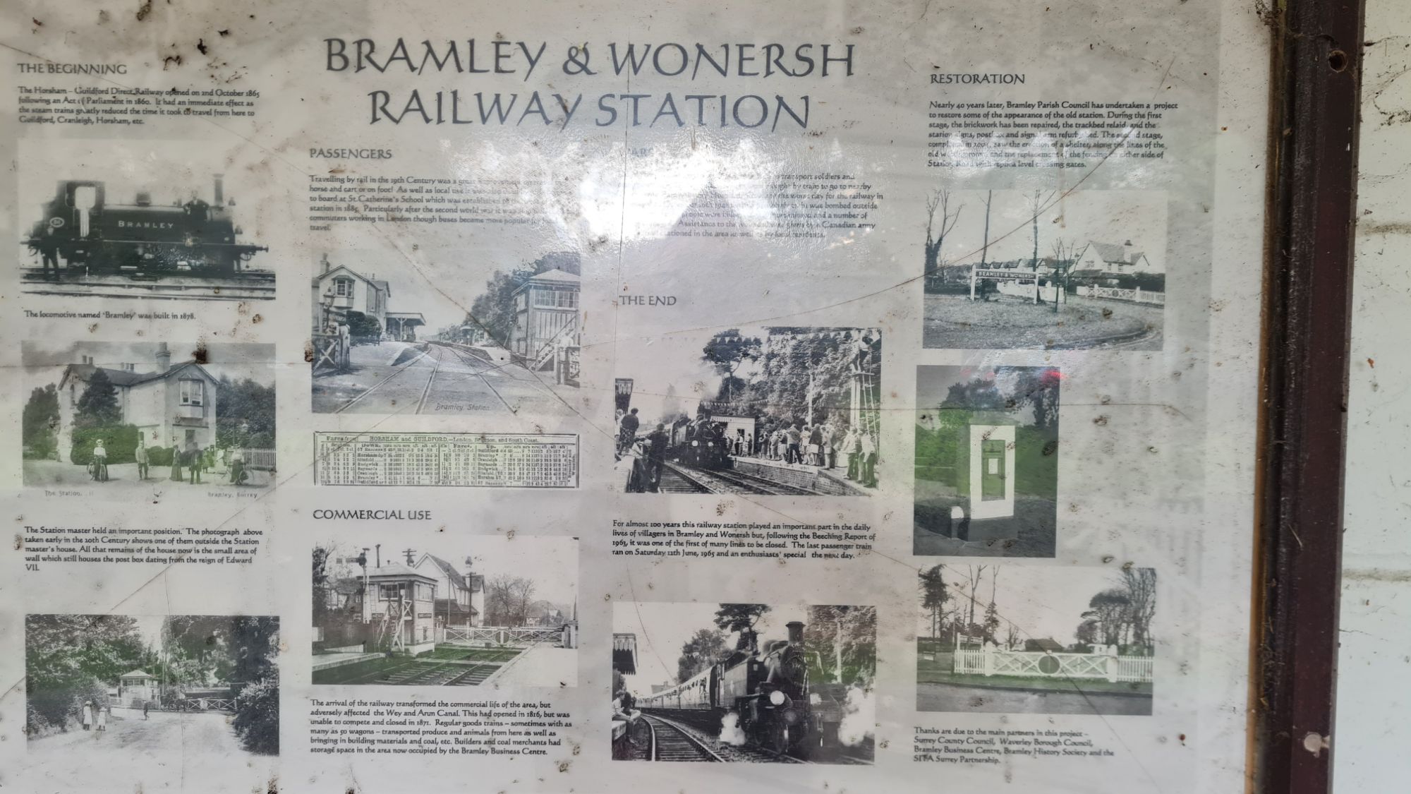 As I ran parallel to the waterway for a few more minutes, the rears of houses started to appear. I was back among civilisation, specifically the village of Bramley. Looking ahead, I could see the path open up and a long platform appear to my left. I had reached Bramley & Wonersh station, and what a find it was.